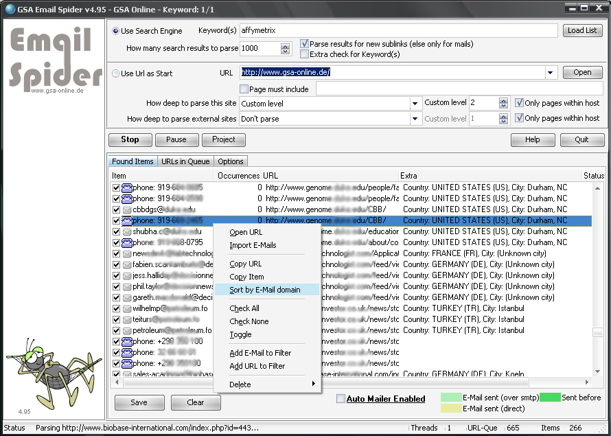 GSA Email Spider je aplikace, díky které získáte všechny e-maily, telefonní a faxová čísla z webových stránek po celém světě pomocí klíčových slov. Na webových stránkách budou analyzovány pomocí této aplikace, díky klíčovým slovům. Je také možné odeslat e-maily svým novým zákazníkům. Program se skvěle hodí hlavně pro marketing. Poskytuje výhody pro vaše podnikání a dovoluje založit novou zákaznickou základnu s dobrou reklamou!