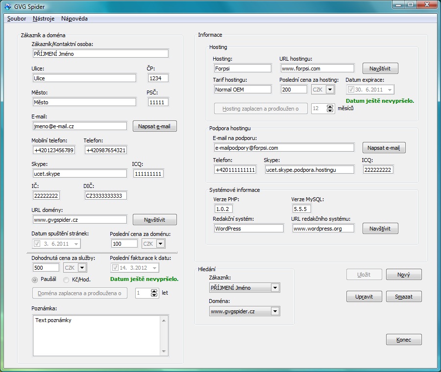 Tento program slouží všem, kteří se zabývají vytvářením webových stránek na zakázku, kde je součástí i správa doménových jmen, databází a dalších důležitých informací. Často se totiž stává, že zákazník po realizaci a spuštění webové prezentace žádá i její následnou správu. Proto je třeba provádět aktualizace webu, hlídat expiraci hostingu, na kterém web běží, hlídat expiraci domény, atualizace databázového prostředí a mnoho dalších drobností. Pokud je však takových zakázek více, je snadné ztratit přehled a velmi snadno může dojít k opomenutí důležité skutečnosti, která může mít neblahý vliv na spravovanou internetovou prezentaci. Program GVG Spider Vám však v takovýchto situacích dokáže pomoci. Stačí pouze zadat každého zákazníka do jeho databáze, vyplnit všechna požadovaná pole, nastavit datumy expirací a další informace a pak už jej nechat pracovat buď na pozadí, kdy (podle nastavení), může v pravidelných intervalech kontrolovat všechny důležité datumy nebo, pokud není aktivována automatická kontrola, lze jednoduchým prohlížením databáze zjistit stav všech důležitých informací. Další velkou výhodou aplikace je způsob práce s databází informací. Všechny údaje tak nejsou uloženy v jedné centrální databázi, ale jsou rozděleny podle jednotlivých zákazníků, což má za následek velmi rychlou práci s programem a taktéž eliminaci nejrůznějších možných problémů s databázovým souborem. Jinými slovy, Vaše uložená data jsou naprosto bezpečně spravována a nehrozí prolémy ani při velkém počtu zadaných údajů.