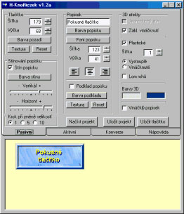 Ve druhé záložce je možné vytvářet aktivní tlačítka které se změní po najetí myší a případně přidávat zvuky a akce na stisk tlačítek.Po jednoduchém vložení potřebných parametrů bude vygenerován html kód který můžete pomocí schránky přenést do editoru Brouček nebo libovolného jiného který umí pracovat se schránkou.Ve třetí záložce můžete hotová tlačítka převádět do jiných formátů nebo konvertovat do černobílé podoby.To je vhodné k " rozsvěcování " tlačítek na stránce.