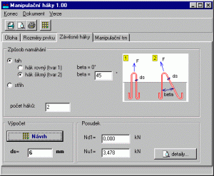 Program provádí návrh úchytů pro manipulaci s dílci podle ČSN 731201 příloha 11. Je možné navrhovat háky namáhané tahem nebo střihem.