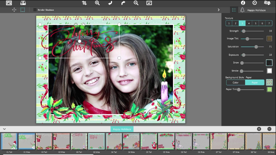 Happy Holidaze je program ve kterém si rychle a jednoduše můžete upravit své fotografie pomocí textur a rámečků s vánoční tématikou. Je také možné použít několik editačních nástrojů pro přizpůsobení odstínu, sytosti nebo expozice, stejně tak lze aplikovat sněhové vločky. Součástí je velké možství předpřipravených rámečků s vánočními stromky, dárky, sněhuláky, zvonky a dalšími objekty s typickou vánoční tématikou. Program vám pomůže vyladit všechny aspekty tak, aby vaše fotgrafie byla přesně podle vašich představ.