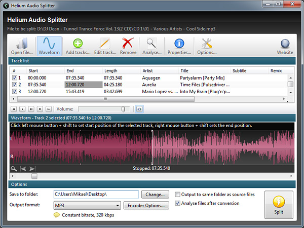 Helium Audio Splitter je program umožňující rozdělit jeden zvukový soubor na několik stop.