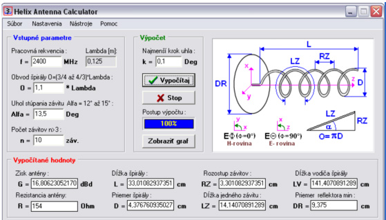 Helix Antenna Calculator umožňuje vypočítat roměry spirálové antény, vyzařovací charakteristiku (funkci F(Θ) v rovinách x-z a y-z). Dále umí simulovat vliv změny konstrukčních parametrů na změnu vyzařovací charakteristiky a výpočet integrálních funkcí, které se často při anténě počítají.