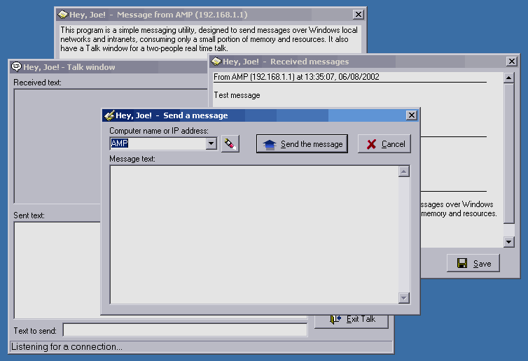 Hey, Joe! je jednoduchá aplikace, vytvořena pro zasílání zpráv po lokálních sítich Windows a intranetů. Je výhodná pro psaní krátkých zpráv ostatním uživatelům po místní síti.