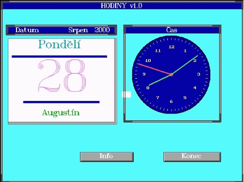 Program graficky zobrazí pomocí analogových hodin čas, datum, den v týdnu a kdo má svátek. Náhrada za DOSovský příkaz Time, ale bez možnosti čas nastavovat.
