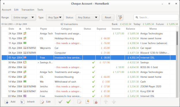 HomeBank je software, který vám pomůže spravovat osobní účetnictví. Je navržen tak, aby byl snadno ovladatelný a musí být schopen analyzovat Vaše osobní finance v detailu pomocí výkonných nástrojů filtrování a přehledných grafů. Nabídka umožňuje spravovat finanční údaje pro více účtů. Kromě toho, všechny důležité údaje se zobrazí ve třech menších oknech, které zobrazují podrobné informace o účtech, top 5 výdaje a plánované transakce po dobu nejvýše jednoho roku či menších časových rámců. Program disponuje asistentem importu, kde mohou být zahrnuty důležité údaje bank s podporou formátů, jako je QIF, QFX a CSV. Funkce "export" vytvoří soubor QIF v umístění, které určíte.