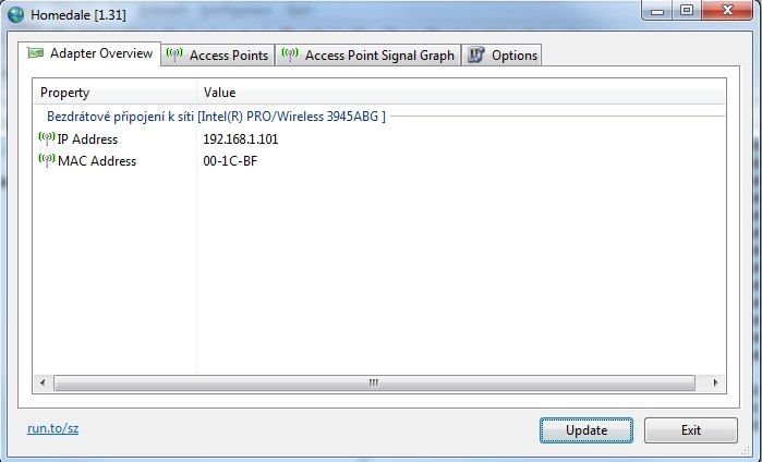Při spuštění programu se vám zobrazí jedno hlavní okno, které je rozděleno na čtyři záložky. V první vám prozradí informace o používaném adaptéru ve vašem počítači. Dále také zjistíte informace o síťové kartě, její název, IP adresu pro vnitřní síť a také samozřejmě jedinečnou MAC adresu.