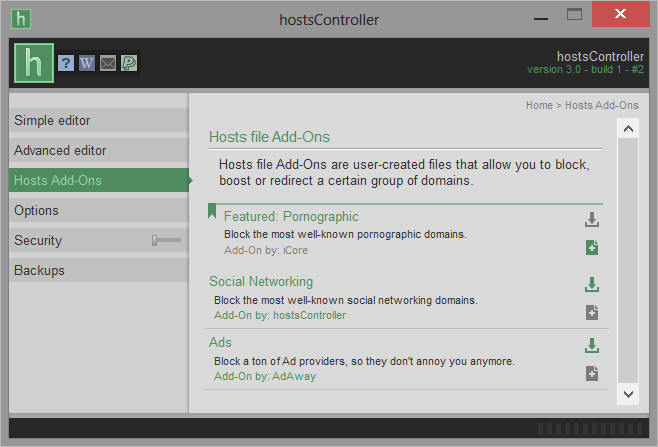 HostsController se dá použít např. pokud chcete zabránit příchozím nevyžádaným reklamám. Tímto programem můžete blokovat, odblokovat nebo přesměrovat kteroukoliv doménu. Add-Firefox Vám umožní provést opatření k velké skupině domén. Pokud se rozhodnete soubor editovat, automaticky vytvoří zálohu pro případ, že budete potřebovat vrátit úpravu zpět.