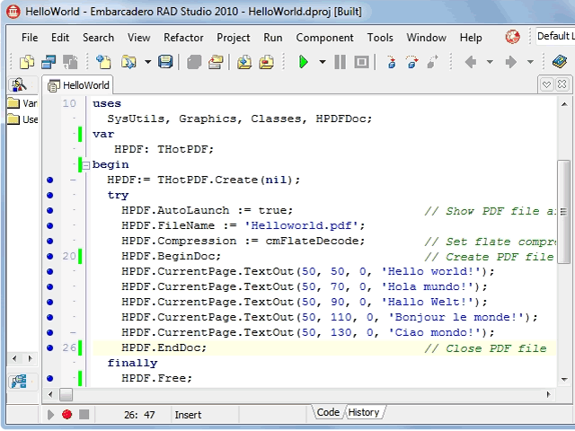 HotPDF Delphi PDF Component je Delphi a C ++ Builder komponenta pro vytváření PDF dokumentů. HotPDF nevyužívá žádný DLL nebo jiný software pro vytváření PDF souborů.