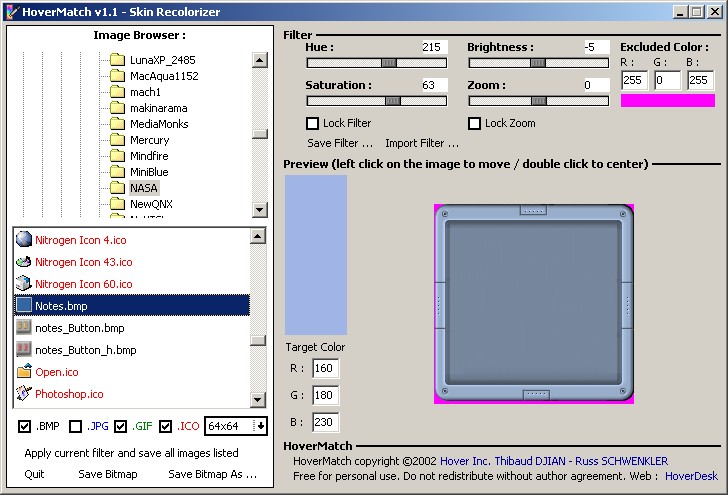 HoverMatch je freeware utilita pro přizpůsobení desktopu upravením dosavadních skinů, a to změnou odstínu, sytosti a jasu obrazu. Tento nástroj umožňuje uživatelům měnit témata a skiny bez nutnosti použití image editoru.