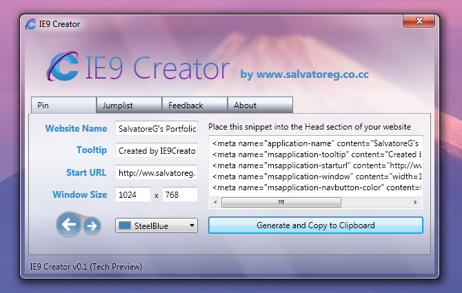 Chcete-li použít IE9 Creator, stačí nahrát svou webovou stránku do programu a poté kliknout na tlačítko "Generovat". Program vygeneruje HTML kód, který můžete vložit do své webové stránky. Jakmile je kód vložen, připnete webovou stránku k hlavnímu panelu nebo nabídce Start kliknutím na tlačítko "Připnout".