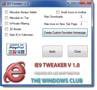 IE9 Tweaker umožňuje vyladit následující nastavení v aplikaci Internet Explorer 9: