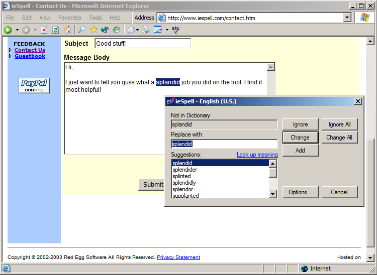ieSpell je užitečný doplňkem prohlížeče Internet Explorer pro kontrolu anglického textu webové stránky. Příjde vhod zejména uživatelům, kteří často pracují s textem (psaní mailů, diskusní fóra, blogy, ..). Rychle zkontroluje pravopis textu a upozorní vás na případné chyby. Kontrolu pravopisu lze spustit pomocí kontextového menu, nástrojové lišty nebo přes menu.