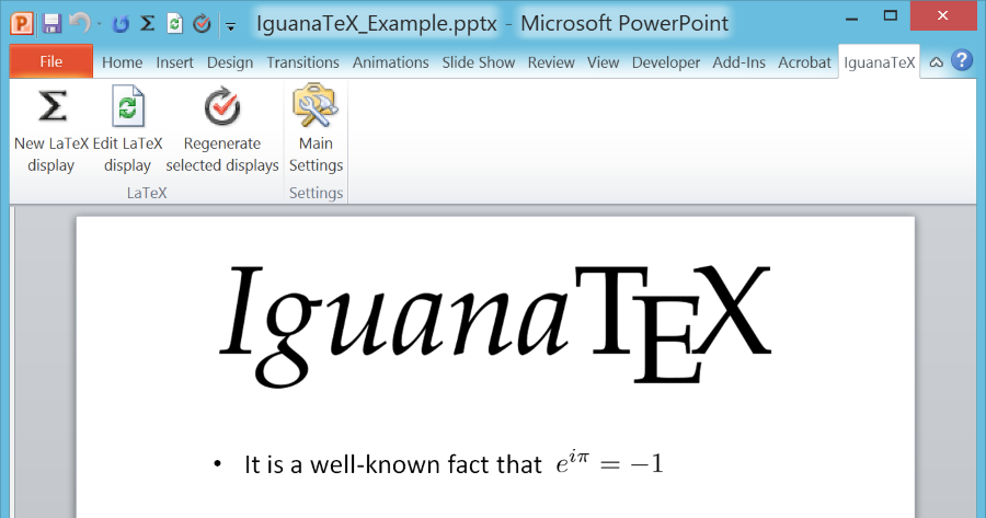 IguanaTeX je nástroj, pro použití LaTeX kódu a rovnic do PowerPoint prezentace. Tento doplněk lze nainstalovat přímo do aplikace Microsoft Office PowerPoint. Funkce a nástroje jsou dostupné v horní nástrojové liště (ribbon). Na základě vloženého LaTeX kódu se generují obrázky, které mohou být do prezentace vloženy. Obrázky je možné upravit ve stylu animace, rotace nebo změny velikosti.