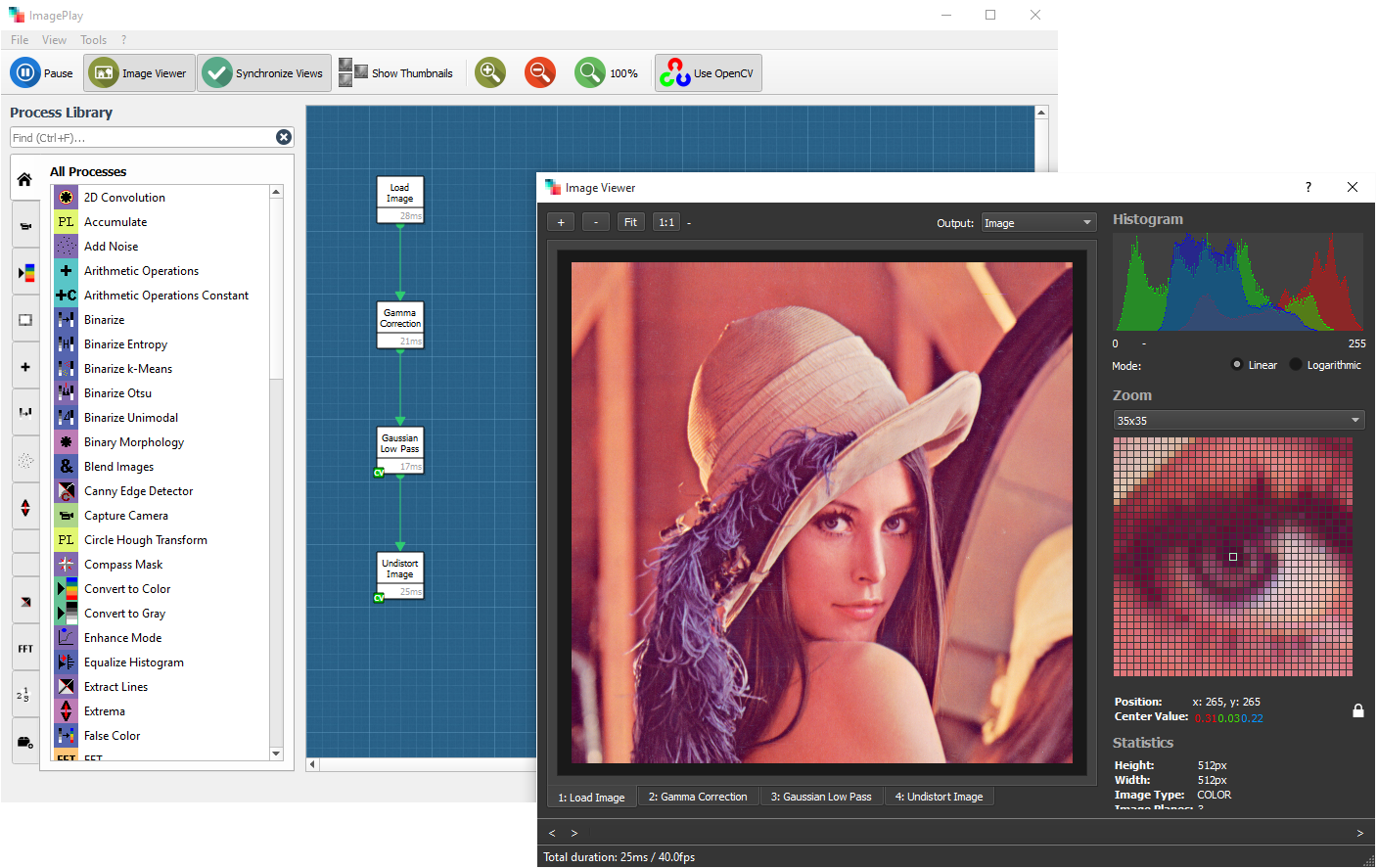 Dodává se s více než 70 jednotlivými obrazovými procesy, které lze kombinovat do složitých procesních řetězců. Hodí se pro vzdělávací účely. K dispozici jsou algoritmy pro načítání obrázků, ukládání obrázků, rotaci a změnu velikosti, aritmetické výpočty, bodové operace, lokální operace (přidání šumu, extrakce linií, normalizace iluminace) nebo matematickou morfologii.