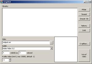 Img2Avi je jednoduchý program, který umí převést zadané obrázky na videosekvenci ve formátu avi. Všechny obrázky musí mít stejnou velikost.