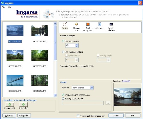 Imgares je šikovný nástroj pro hromadné zpracování vašich digitálních fotografií. Umožňuje vytvářet pěkné slideshow (jako avi video) a měnit velikost fotografií. Mezi další funkce patří: vkládání přechodných efektů do prezentací, rotace fotografií, přidávání textu nebo vlastního komentáře atd.