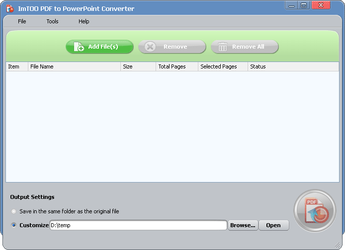 ImTOO PDF to PowerPoint Converter je nástroj, který je umí konvertovat PDF dokumenty do PPT prezentací se zachováním originálního obsahu (obrázky, tabulky, hypertextové odkazy, ..) a původním rozvržením.