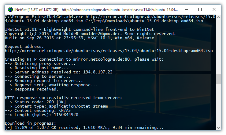 INetGet je jednoduché rozhraní příkazové řádky (CLI - command line) pro WinINet API. Je to program pro stahování souborů přes HTTP nebo FTP protokoly. Plná podpora pro zabezpečený protokol HTTPS (HTTP přes TLS), stejně jako IPv6. InetGet je založený na nativním Windows Internet programovacím rozhraní (WinINet).