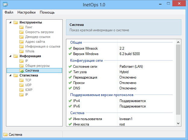 InetOps Vám umožní provádět síťové operace, jako je ping, měření rychlosti stahování, dekódování, zobrazování IP adres webových stránek, zobrazení informace o URL (velikost, datum změny, atd.), zobrazení IP adresy (včetně externí adresy), zobrazí WHOIS informací o doménách, zobrazení sdílených prostředků, informační okno síťového provozu, zobrazení IP, TCP, UDP, ICMP statistik. Plná podpora IPv6.