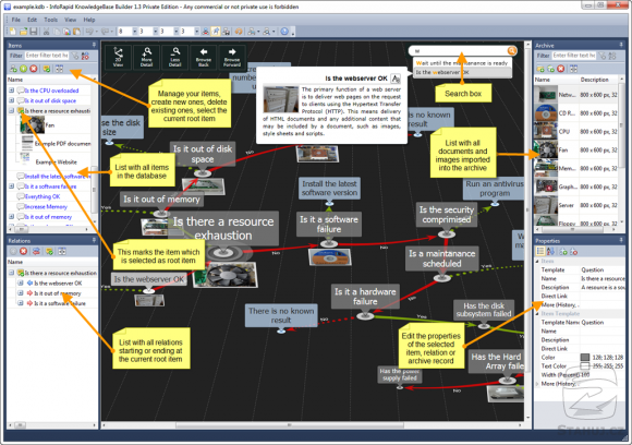 InfoRapid KnowledgeBase Builder je komplexní program, který poskytuje množství funkcí a nástrojů pro vytváření složitých myšlenkových map s podporou až několika miliónů propojených položek. Jediná myšlenková mapa dokáže pojmout všechny vaše myšlenky a nápady zcela jasným a pochopitelným způsobem. Zatímco tradiční programy pro tvorbu myšlenkových map nepodporují křížové propojení myšlenek, tento nástroj ano. Navíc obsahuje archiv pro dokumenty, obrázky a webové stránky, které mohou být připojeny k myšlenkám pro pojmutí většího množství informací s minimálním využití prostoru.