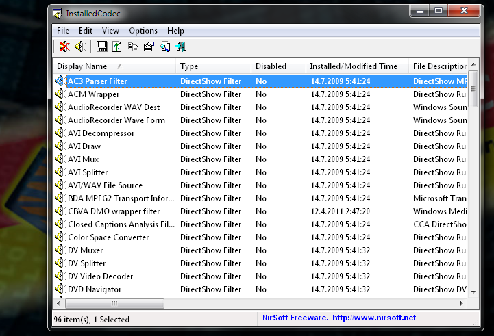 InstalledCodec je malý nástroj pro zobrazení seznamu všech ovladačů kodeku a DirectShow filtrů aktuálně nainstalovaných ve Vašem systému. Pro každou složku se zobrazí následující informace: název, typ, vypnutý nebo zapnutý stav, čas instalace, popis, název společnosti, název souboru a další ... To vám umožní snadno vypnout nebo zapnout jakoukoli Codec / DirectShow složku nebo exportovat seznam do textového / xml / html souboru.
