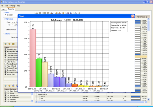 Internet Access Monitor for EServ je software pro sledování přípojení internetu. Poskytuje informace o stahování (co a kdy), připojení, o přenosu dat a zatížení. Můžete také sledovat internetový přístup zaměstnanců, pracovat se všemi moderními proxy servery atd.