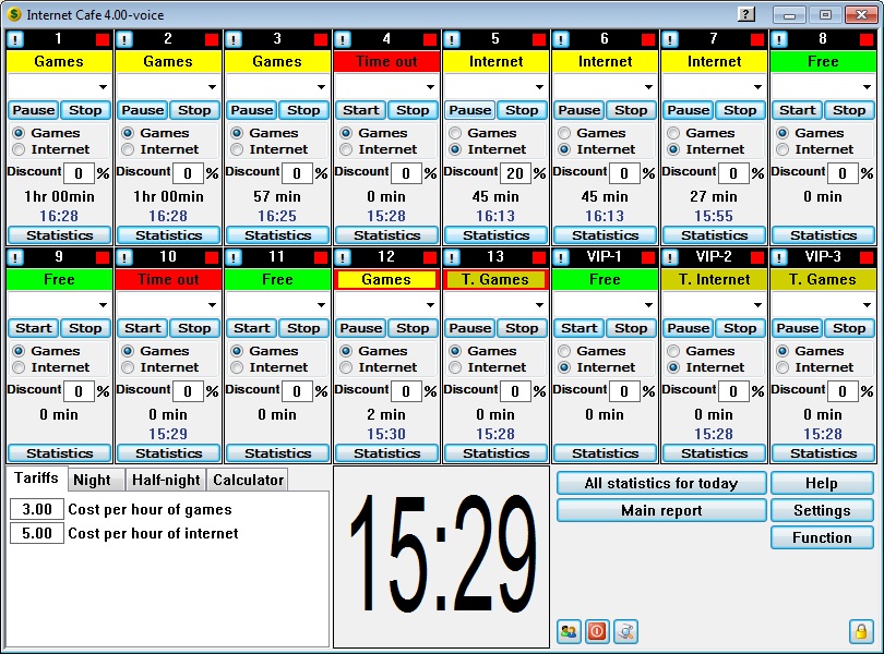 Internet Cafe je program pro komplexní řešení správy a automatizace práce v internetových kavárnách, počítačových kroužků, kybernetických kavárnách a herních centrech. Program Vám poskytuje uzamknutí přístupu k jednotlivým počítačům, pokud návštěvník nezaplatil za jeho použití. Tím spolehlivě znemožíte výskyt úprav systému, programů, ztráty dat apod.. S programem řídite přístup k internetu či ovládání tiskárny.