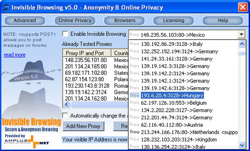 Invisible Browsing umí změnit nebo maskovat vaši IP adresu routovaním přes zámořské servery. Toto vám poskytne v internetu anonymitu.