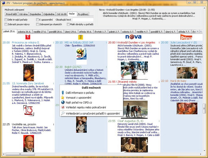 Televizní program do počítače pro více než 100 českých, slovenských a dalších televizních a rádiových stanic až na 14 dní dopředu, který nabízí: