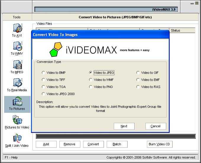 iVideoMAX je silný nástroj pro hromadnou konverzi video souborů s pokročilými funkcemi, jako spojování videa, vypalování atd.