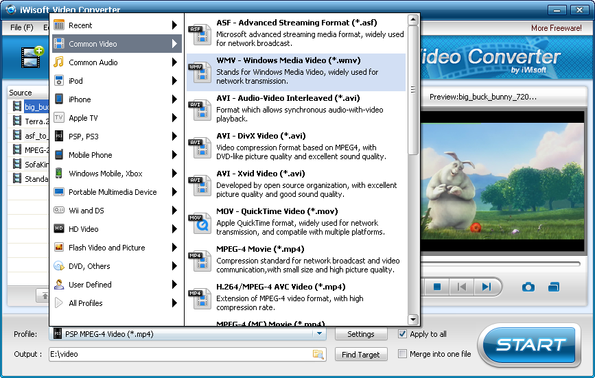 iWisoft Free Video Converter umožňuje rychlý převod videí mezi populárními formáty, jako jsou AVI, MPEG, WMV, DivX, XviD, MP4, H.264/AVC, AVCHD, FLV, MKV, RM, MOV, 3GP. Dále převádí audio ve formátech MP3, WMA, WAV, RA, M4A, AAC, AC3, OGG. Dále podporuje převod do formátu pro přehrávání na PSP, iPod, iPhone, Apple TV, PS3, Xbox, Zune, Creative Zen, Archos a dalších multimediálních zařízeních. Obsahuje silné video editační funkce.