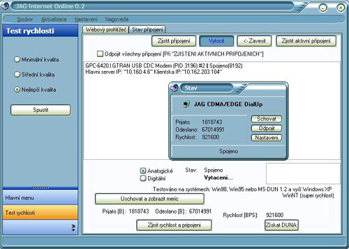 JAG Internet Online udržuje připojení a slouží na připojování a odpojování. Dále sledování FUP. Integrován JAG Firewall Personal, SMS odesílaní do všech sítí, mnoho vzhledů až 55 vzhledů.