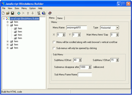 JavaScript BlindsMenu Builder vám vytvoří JavaScriptové menu pro stránky jednoduše a rychle. Menu tvoříte pomocí stromové struktůry v programu, ke každé položce můžete nastavit písmo, barvu, URL cestu a další efekty. Výsledek si můžete zobrazit ihned v prohlížeči.