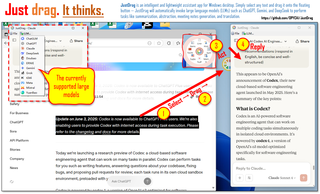 JustDrag je inteligentní a nenáročná pomocná aplikace pro počítače se systémem Windows. Stačí vybrat libovolný text a přetáhnout ho na plovoucí tlačítko – JustDrag automaticky využije velké jazykové modely (LLM), jako jsou ChatGPT, Gemini a DeepSeek, k provedení úkolů, jako je shrnutí, abstrahování, vytváření zápisů z jednání a překlad.