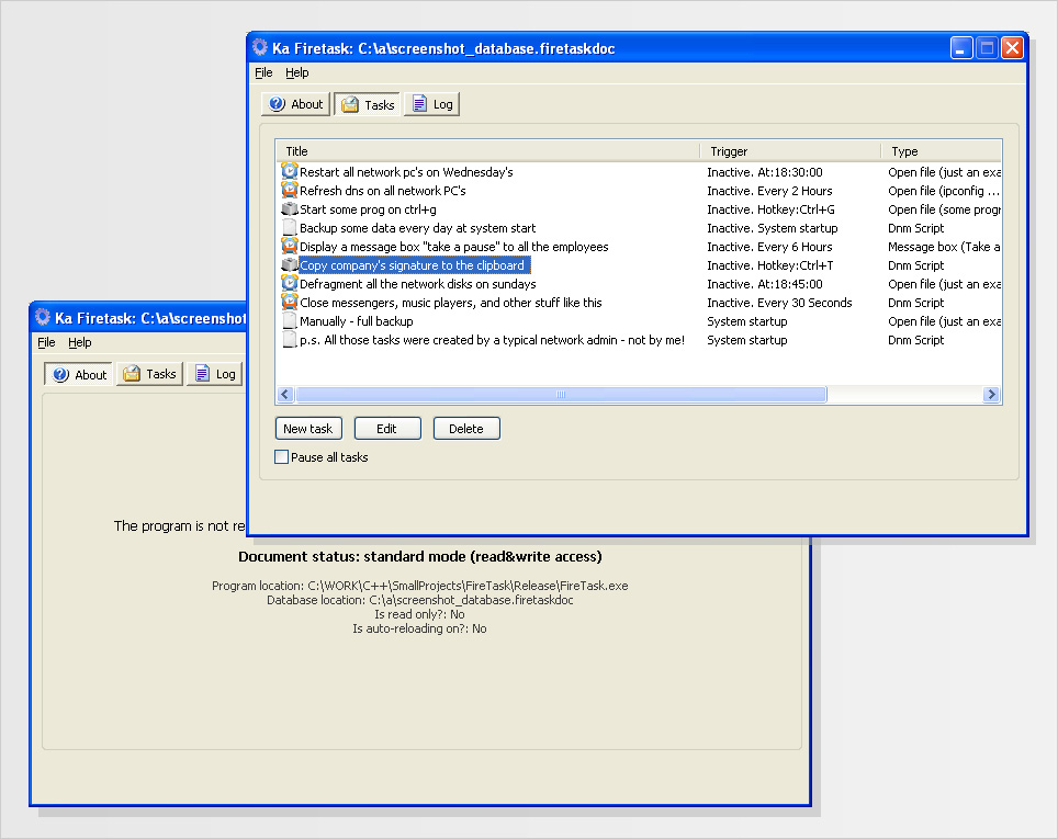 Z aplikace Ka Firetask můžet spouštět windows programy, kopírovat soubory a složky, zobrazovat dialogy zpráv, spustit tzv DNM skripty. Tyto úkony lze provádět prostřednictvím horkých kláves nebo podle nastavených pravidel.