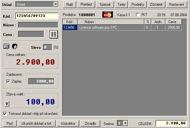 Prodej Kasa - prodej na pokladně s ovládáním pokladní zásuvky, zákaznického displeje, podporou a tiskem čárového kódu. Tisk prodejek v několika formátech včetně pokladních tiskáren. Zboží je odebíráno ze skladů a pohyby se promítají v uzávěrkách skladů a pokladny. Uzávěrky za období nebo za směnu lze provést též podle skladů nebo obsluhy přihlášené heslem. Rozsah oprávnění uživatelů nastavuje správce systému. Lze zakázat náhled nákupních cen apod. Výpisy prodaného zboží, slevy, vyhledávání podle kódu, názvu, částky, rychlé fulltextové vyhledávání položek, přehled. Možnost složených výrobků, prodeje s různým nákupním a prodejním DPH, obaly. Lze vkládat texty, vracet zboží z reklamace, provádět výkup zboží přes pokladnu. Záruky, sériová čísla zboží. Jednoduchá a velmi rychlá obsluha zkratkovými klávesami. Vše je logické a intuitivní, obsluhu zvládne i nezaškolený personál.