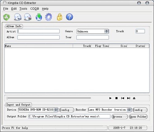 Kingdia CD Extractor je výkonná CD ripovací aplikace pro konvertování audio stop přímo z CD do audio formátů MP3, WAV, WMA, OGG, VQF, APE atd. Podporuje také vzájemnou konverzi mezi formáty MP3, WAV, WMA, OGG, VQF, APE. Program obsahuje CD přehrávač.