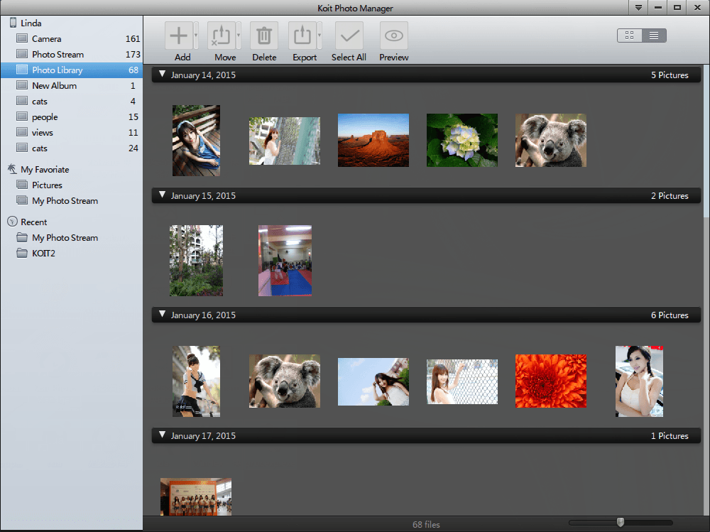 Koit Photo Manager je výkonný nástroj pro správu fotografií na iPhone. Přidat, odstranit, exportovat a vytvořit alba rychle a jednoduše s podporou v dávkovém režimu. U kopírování dat na iPhone je nutné dodržet souborové formáty BMP, JPG, JPEG a PNG. K dispozici je i vestavěný prohlížeč snímků s možností jejich full screen prezentace.