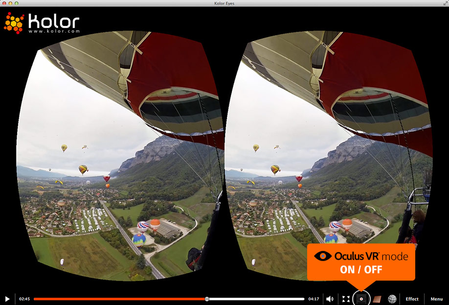 Kolor Eyes Desktop je 360 ° video přehrávač pro Windows. To vám umožní hrát a komunikovat se svými 360 ° videa v počítači a na vašem Oculus Rift. Otočte na 360 stupňů, zvětšovat a zmenšovat, měnit projekci a použít vizuální efekty. Kolor Eyes využívá protokol UDP, abyste mohli vytvořit několik instancí softwaru (Kolor Eyes nebo software třetích stran), ke sdílení informací ze stejného hlavního umístění například: podívejte se na video v Oculus Rift, když hraje také ve standardní projekci na druhé obrazovce.