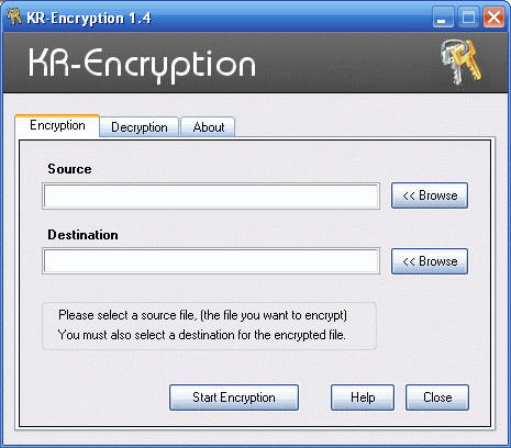 KR-Encryption je snadno použitelný. Stačí načíst data, která chcete šifrovat, a zadat lokaci, kam se budou ukládat šifrovaná data. Dešifrování dat funguje stejným způsobem, stačí se přepnout na záložku pro dešifrování.