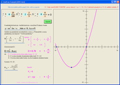 Tento prográmek vám nakreslí průběh funkce, vypočítá kořeny rovnice a souřadnice vrcholu paraboly. Hodnoty a, b, c mohou být i desetinné čísla. Tato verze pracuje se zlomky.