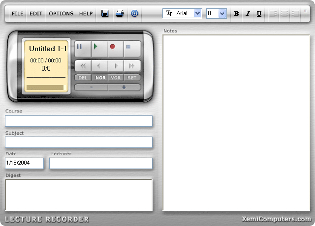 Lecture Recorder je skvělý pomocník, pokud si chcete zaznamenat, shrnout a následně sdílet Vaše přednášky. Tento program vám umožní nahrávat přednášky a připojit textové poznámky. Je zde k dispozici několik textových polí pro shrnutí: předmět, datum, přednášející, poznámky, .... a dále možnost tisku.