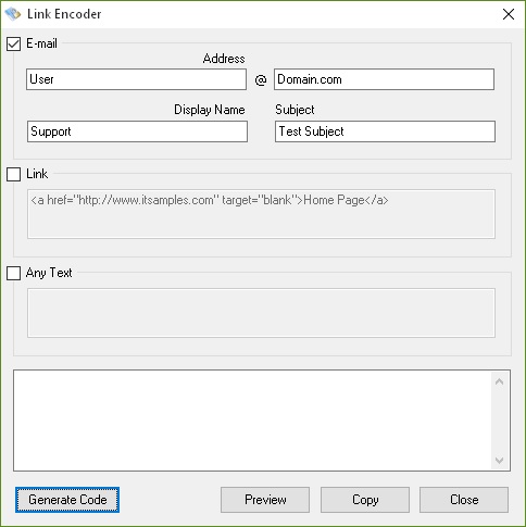 Link Encoder bude generovat text pro e-mailové adresy a odkazy, který můžete zkopírovat a vložit do svých webových stránek. Zdrojový kód generovaný Link Encoderem je kompatibilní se všemi hlavními prohlížeči.