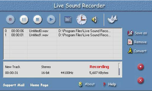 Tento program vám umožní uložit audio z jakéhokoli zdroje do formátu WAV či MP3. Nahrát můžete veškeré zvuky z vašeho počítače: streamované audio z Internetu, hudbu přehrávanou jinými programy, jako je například Winamp, Window Media Player, Quich Time, Real Player či Flash a hudbu a zvuky z her. Live Sound Recorder samozřejmě umožňuje i nahrávání audia z připojeného mikrofonu či audio vstupu.