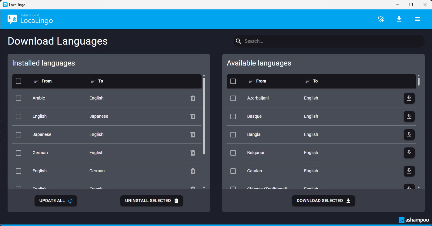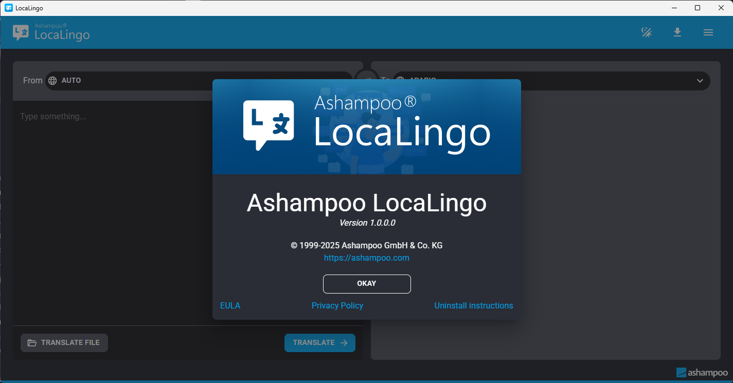 Ashampoo LocaLingo nabízí robustní překladatelský nástroj, který spojuje pokročilou technologii AI se špičkovým zabezpečením dat. Software umožňuje vysoce kvalitní automatické překlady do 45 jazyků, které lze stáhnout přímo do vašeho počítače.