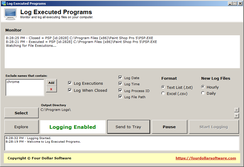 Log Executed Programs je nástroj pro monitoring všech spuštěných a ukončených programů. Samozřejmostí je zobrazení datumu a času události, ID procesu (PID) a cestu ke spustitelnému souboru (resp. umístění souboru na disku). Lze určit v jakém souborovém formátu bude log uložen (TXT nebo CSV). V logu je možné vynechávat předem definované programy, a to vepsáním celého názvu nebo jeho části. Log se zobrazuje přímo v okně programu.