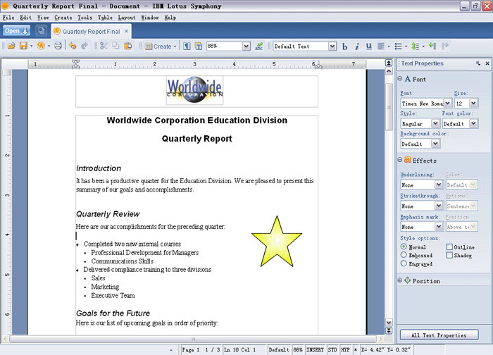 Lotus Symphony je bezplatný kancelářský balík, který nabízí vše, co potřebujete k vytvoření profesionálních dokumentů, prezentací a tabulek. Je založen na open source technologii OpenOffice.org, ale nabízí také řadu nových funkcí a vylepšení.