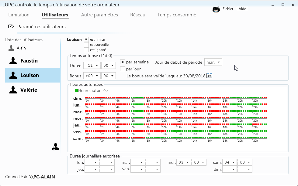 LUPC je software, který je určen pro monitorování uživatelských aktivit. Monitorování je možné přizpůsobit (monitorování stráveného času pouze ve vybraných aplikacích, na konkrétních portech a serverech, apod.). LUPC umožňuje nastavit maximální denní nebo týdenní lhůty pro každou osobu a také lze snadno nastavit, které dny v týdnu a hodiny bude přístup povolen. Zvukové notifikace předem upozorní na ukončení relace, pak bude uživatel automaticky odhlášen. Při přístupu do aplikace je vyžadováno heslo, které je nutné zadat ihned po dokončení instalace. Samozřejmostí je graf využití počítače pro jednotlivé dny.