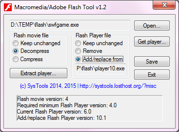 Macromedia/Adobe Flash Tool je nástroj, který provádí kompresi a dekompresi SWF souborů, stejně jako umožňuje přidání i nahrazení spustitelného Flash přehrávače. Soubory lze otevřít z příkazového řádku, nebo pouhým přetažením souboru na ikonu programu.